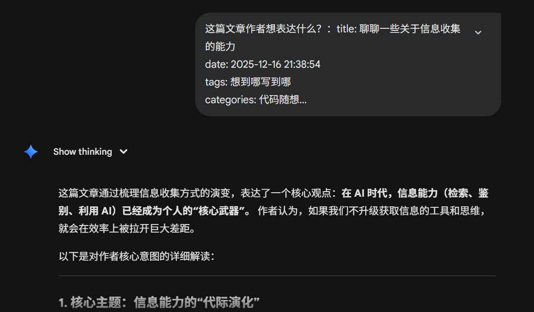 为什么突然想写段这样的文字呢?这是因为很长一段时间我都发现很多人都缺乏信息检索/运用ai/辨别信息的能力,而这些能力在这个时代我认为是不可缺乏的。虽然我聊聊也不会改变什么,但是聊聊总比没聊好吧~